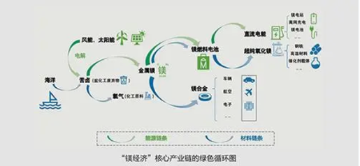 “镁经济”是新能源与新材料相融合的绿色循环经济。“镁经济”绿色循环产业链的源头,从原料讲是取之不尽的海卤水,从能源讲是用之不竭的可再生能源。利用镁既是工业材料又是能源载体的双重属性,“镁经济”可同时实现新能源和新材料两大产业的绿色循环、优势整合:既解决了风光电的储能难题,又将无法处理的盐化工行业废弃物苦卤“变废为宝”,变成可带动国民经济众多领域实现产业升级的重要基础材料。